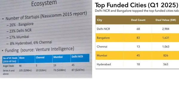 Getting Started Funding 2015 Vs 2025 . Funding stats over the decade. I wanted to share my perspective. Chennai (81pts) has grown considerably. Bangalore (19pts) & Mumbai (18pts) down by many points. Scenario in Hyderabad (31pts) is really shaping up.